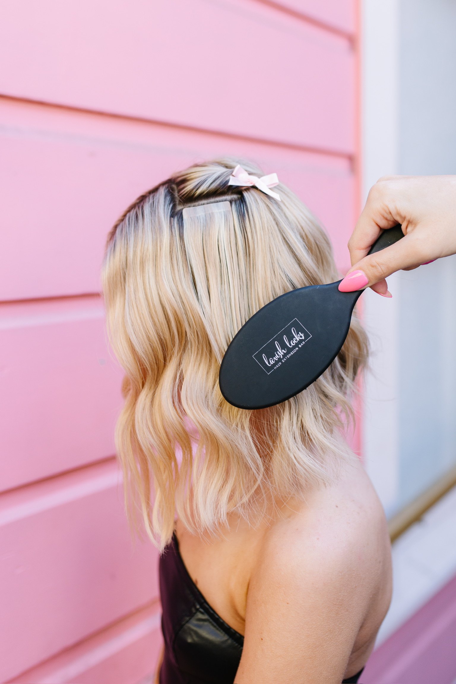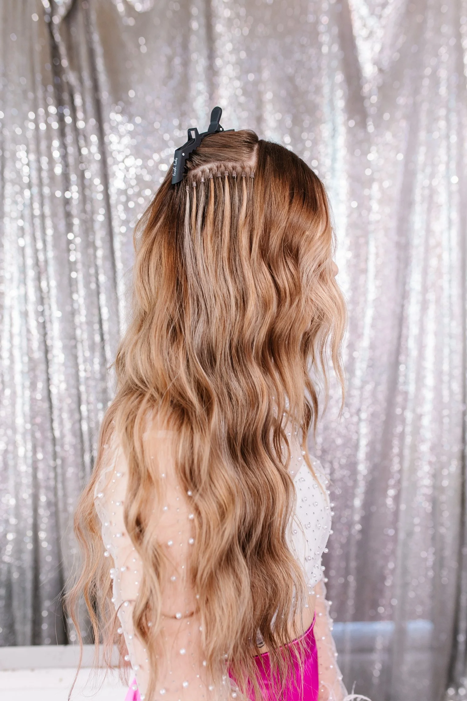 The majority of hair extension installations we complete here at the salon are hand-tied wefts. While our stylists are thoroughly trained in multiple methods, our favorite is our very own lavish hand-tied installation method using lavish locks products. Our weft beads have a silicone lining that provides a cushion between your hair and the bead, to better protect the integrity of the natural hair while also preventing slipping.
